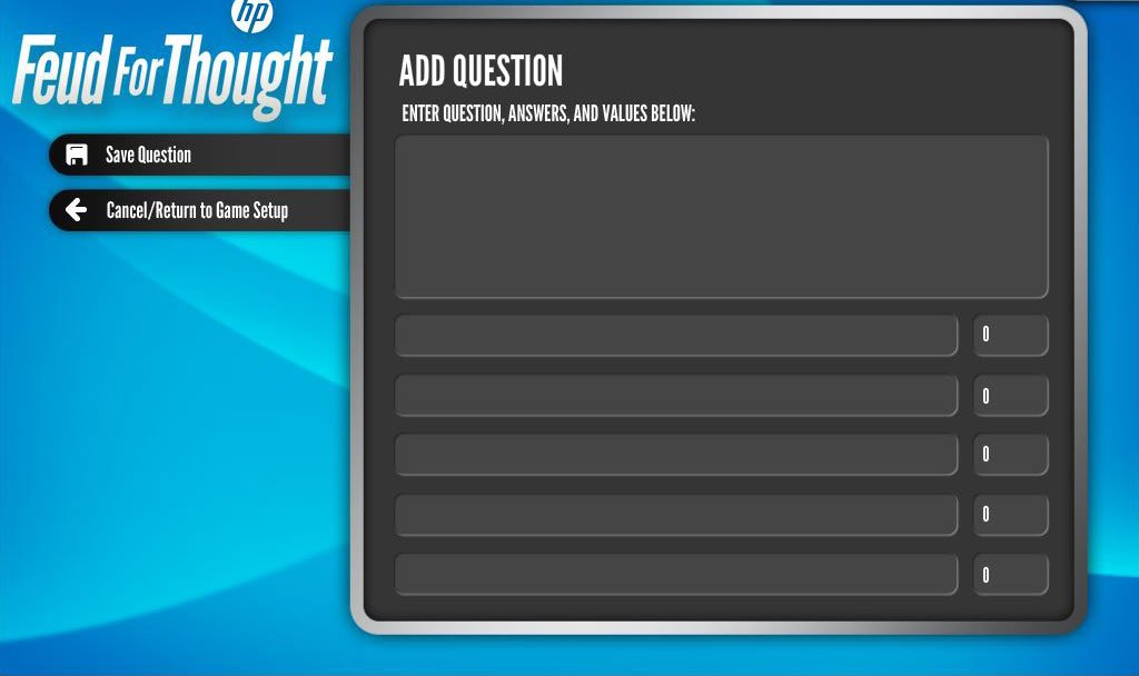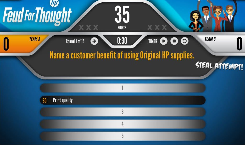 Family Feud styled game created as a training tool for HP print division sales representatives. Included moderator driven gameplay, scoring and flow logic, a library of corporate provided questions and an editor for the moderator to create all new content as needed.
