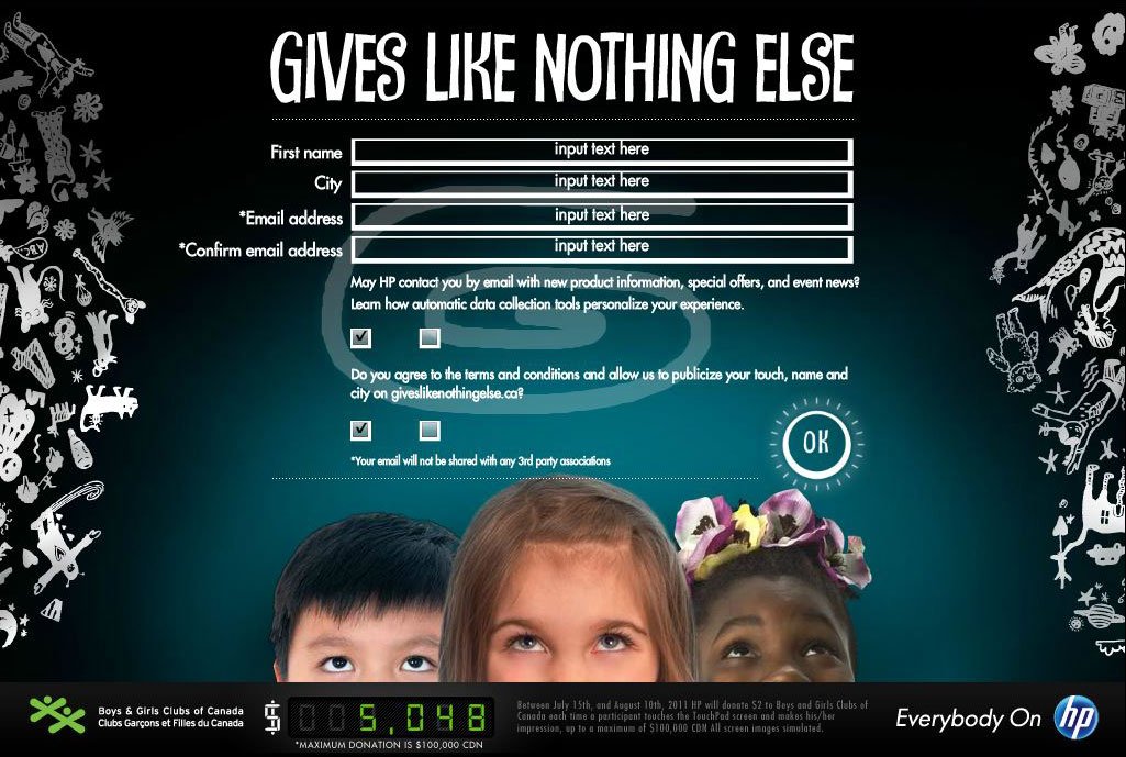 HP TouchPad tablet application and accompanying Web portal and backend with user created gesture input gallery, tied to a non-profit donation campaign. Installed across Canadian retail outlets on demonstration HP Touchpad tablets as a day of launch promotion.